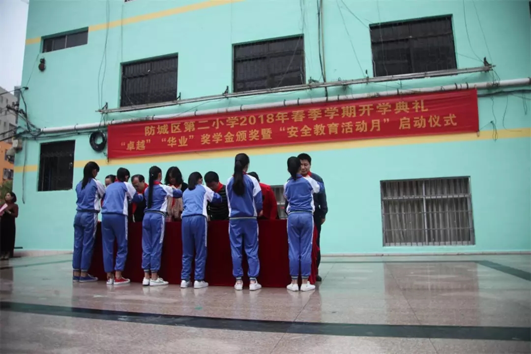3月14日上午,廣西華業(yè)集團(tuán)董事長(zhǎng)龍其生受邀參加防城港市防城區(qū)防城鎮(zhèn)第二小學(xué)的春季開(kāi)學(xué)典禮、獎(jiǎng)學(xué)金頒獎(jiǎng)暨安全活動(dòng)月啟動(dòng)儀式。