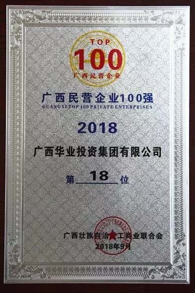 2018年9月29號,廣西壯族自治區(qū)工商聯(lián)合會主辦的首屆“2018年廣西民營企業(yè)100強(qiáng)”發(fā)布會在南寧市隆重舉行,本次會議發(fā)布了2018廣西民營企業(yè)100強(qiáng)、2018廣西民營企業(yè)制造業(yè)50強(qiáng)、2018廣西最具競爭力民營企業(yè)、2018廣西最具潛力民營企業(yè)和2018廣西民營企業(yè)100強(qiáng)調(diào)研分析報告。其中,廣西華業(yè)投資集團(tuán)有限公司榮列第十八名。