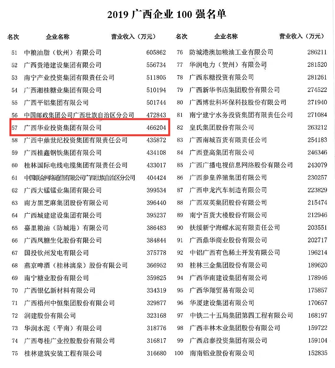 大會(huì)發(fā)布了2019年廣西企業(yè)100強(qiáng)等榜單及廣西大企業(yè)發(fā)展主要研究成果。此次評(píng)選以2018年企業(yè)營(yíng)業(yè)收入作為評(píng)選標(biāo)準(zhǔn),共有100家實(shí)力雄厚的企業(yè)榮登金榜。其中,廣西華業(yè)投資集團(tuán)有限公司,憑借營(yíng)業(yè)收入46.6億元,位列廣西百?gòu)?qiáng)企業(yè)第57位,連續(xù)兩年榮獲“廣西企業(yè)100強(qiáng)”榮譽(yù)稱(chēng)號(hào)!
