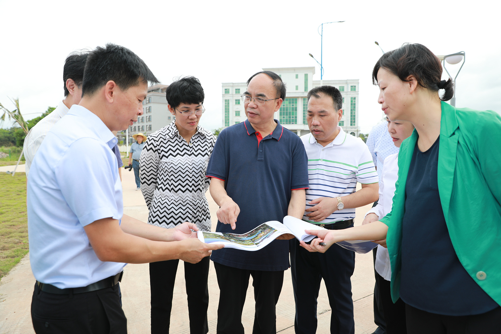陳潔副部長(前排右三)、溫達勤巡視員(前排左二)在調(diào)研現(xiàn)場聽取項目建設情況匯報